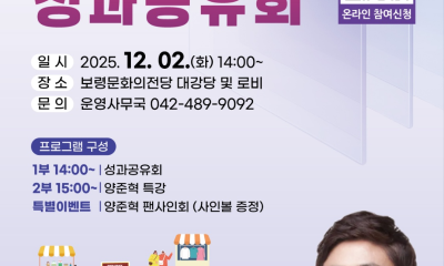 일 시: 2025. 12. 2.(화) 14:00 ~ 18:00 장 소: 보령문화의전당 대강당 및 로비 참석인원: 120명(초청내빈, 창업기업, 참여희망자 등) 주요내용 - 창업지원 사업 추진 경과보고 - 창업팀 성과 공유(우수사례 발표) 및 성과 영상 상영 - 명사 초청 창업 특강(양준혁 야구재단 이사장) - 창업 전시·홍보부스 운영 (창업팀 제품 홍보 및 체험) - 창업기업 교류 및 네트워킹 [이 게시물은 자영업나라님에 의해 2025-11-12 17:57:44 자영업 게시판에서 이동 됨]