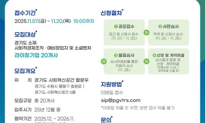 사업목적 : 경기도 사회혁신공간 거점 사회혁신 분야 창업기업 및 소셜벤처 발굴·육성을 통한 지속가능 성장동력 확보 선정규모 : 총 20개사 선정대상 : 경기도 소재 사회적경제조직·예비창업자 및 소셜벤처(경기도 외 소재의 경우 공모요강 참고) 협약기간 : 2025.12. ~ 2026.11.(최대 3년(기본 1년), 6개월 단위 중간평가에 따라 연장 가능) 지원내용 : 사무공간 및 사업화(액셀러레이팅 프로그램) 지원 신청방법 : 신청서류(양식 다운로드 클릭) 이메일(sip@pgvtrs.com) 제출 2025 경기도 사회혁신공간 창업육성 프로그램 사업설명회 신청 바로가기 (11.18(화) 진행) https://event-us.kr/vtrspg/event/116588