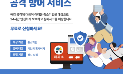 [홈페이지 해킹(디도스, 웹) 공격 방어 서비스] ✔️ 해킹 공격에 대응이 어려운 중소기업을 대상으로 24시간 안전하게 보호하고 침해사고를 예방합니다. ☎️ 특/장점 ✔️ 무료 서비스로 비용 부담 해소 ✔️ 24시간 전문 관제 인력의 실시간 지원 ✔️ 시스템 구축 과정 없이 쉽고 빠른 도입 및 즉각적인 방어 효과 ✔️ 기업 안전성 및 비즈니스 연속성 확보 ☎️ 접수 방법 ✔️ 홈페이지 신청 : https://www.boho.or.kr/kr/subPage.do?menuNo=205111 ☎️ 문의 사항 ✔️ 전화 문의 : 02-405-5533 ✔️ 메일 문의 : sjlee90@boho.or.kr ✔️ 담 당 자 : 이수진 선임